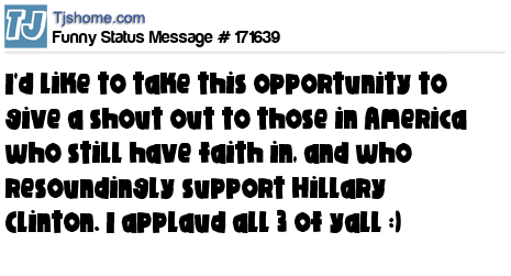 X says I'd like to take this opportunity to give a shout out to those in America who still have faith in, and who resoundingly support Hillary Clinton. I applaud all 3 of yall :)