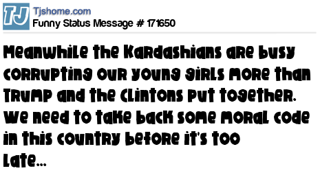 X says Meanwhile the Kardashians are busy corrupting our young girls more than Trump and the Clintons put together. We need to take back some moral code in this country before it's too late...