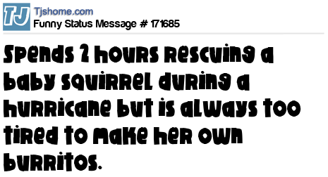 X says Spends 2 hours rescuing a baby squirrel during a hurricane but is always too tired to make her own burritos.
