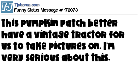 X says This pumpkin patch better have a vintage tractor for us to take pictures on. I'm very serious about this.