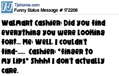 X says Walmart Cashier: Did you find everything you were looking for?... Me: Well, I couldn't find-..... Cashier: *finger to my lips* Shhh! I don't actually care.