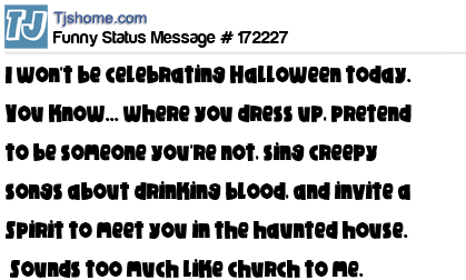 X says I won't be celebrating Halloween today. You know... where you dress up, pretend to be someone you're not, sing creepy songs about drinking blood, and invite a Spirit to meet you in the haunted house. Sounds too much like church to me.
