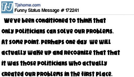 X says We've been conditioned to think that only politicians can solve our problems. At some point, perhaps one day we will actually wake up and recognize that that it was those politicians who actually created our problems in the first place.
