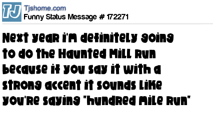 X is Next year i'm definitely going to do the Haunted Mill run because if you say it with a strong accent it sounds like you're saying "hundred mile run"