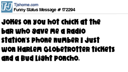 X says Jokes on you hot chick at the bar who gave me a radio station's phone number I just won Harlem Globetrotter tickets and a Bud Light poncho.