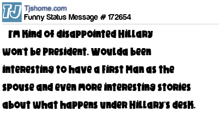 X says I'm kind of disappointed Hillary won't be President. Woulda been interesting to have a First Man as the spouse and even more interesting stories about what happens under Hillary's desk.