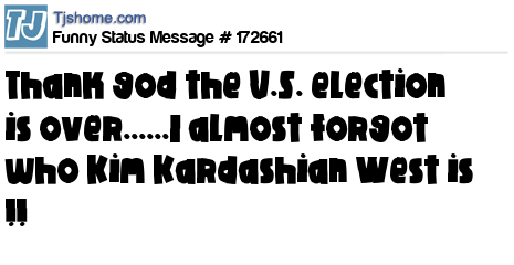 X says Thank god the U.S. election is over......I almost forgot who Kim Kardashian West is !!