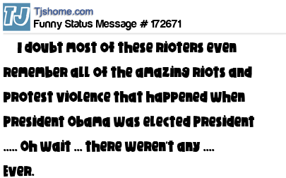 X says I doubt most of these rioters even remember all of the amazing riots and protest violence that happened when President Obama was elected President ..... Oh wait ... there weren't any .... Ever.