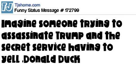 - # 173251 I hope there will never be an assassination attempt on our President Elect. But it would be really funny just to hear the Secret Service yell "Donald, duck!"