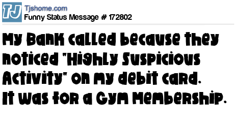 - # 27526 My bank just called me because of suspicious activity on my debit card. They couldn't believe I bought a gym membership either.