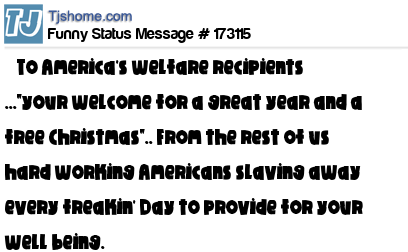 - # 11374 To America's welfare recipients..."your welcome for a great year and a free Christmas"...from the rest of us hard working Americans that work for hard your well being every day.