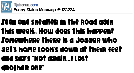 X says Seen one sneaker in the road agin this week.. How does this happen? Somewhere there is a jogger who get's home look's down at their feet and say's "Not again...I lost another one"