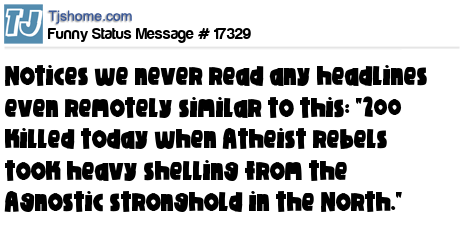 - # 3143 Something you never hear in the news: "200 killed today when Atheist rebels took heavy shelling from the Agnostic stronghold in the North."