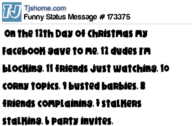 - # 162925 ♪ ♩♩ ♬ On the 12th Day of Christmas my Facebook gave to me, 12 dudes I'm blocking, 11 friends just watching, 10 corny topics, 9 busted barbies, 8 friends complaining, 7 stalkers stalking, 6 party invites, Fiiiiiiiiiiiiive Drama Queeeensssss,