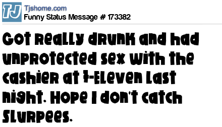 X says Got really drunk and had unprotected sex with the cashier at 7-Eleven last night. Hope I don't catch Slurpees.