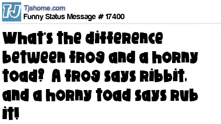 X is what's the difference between frog and a horny toad? A frog says ribbit, and a horny toad says rub it!