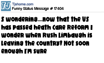 X s wondering....now that the US has passed heath Care Reform I wonder when Rush Limbaugh is leaving the country? Not soon enough I'm sure