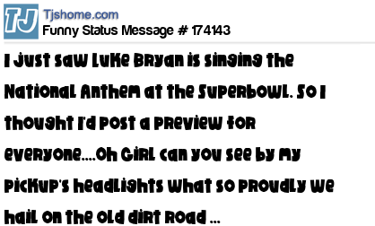 X says I just saw Luke Bryan is singing the National Anthem at the Superbowl. So I thought I'd post a preview for everyone....Oh Girl can you see by my pickup's headlights what so proudly we hail on the old dirt road ...
