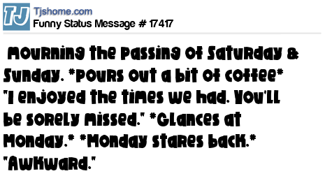 X mourning the passing of Saturday & Sunday. *pours out a bit of coffee* "I enjoyed the times we had. You'll be sorely missed." *Glances at Monday.* *Monday stares back.* "Awkward."