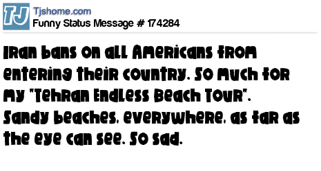 X  Iran bans on all Americans from entering their country. So much for my "Tehran Endless Beach Tour". Sandy beaches, everywhere, as far as the eye can see. So sad.