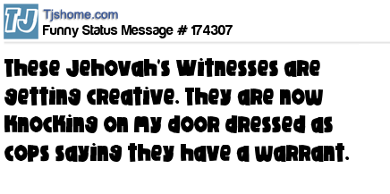 - # 149428 Nice try Jehovah's Witnesses but dressing up like cops and telling me you have a warrant is not going to get me to open my door.