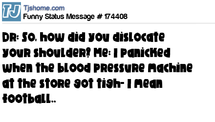 X says Dr: So, how did you dislocate your shoulder? Me: I panicked when the blood pressure machine at the store got tigh- I mean football..