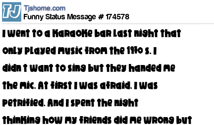 - # 174573 I went to a karaoke bar last night that refused to play songs from the 70's. At first I was afraid,I was petrified.