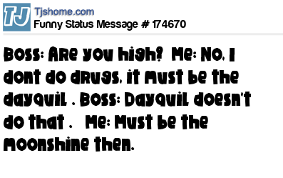 X says Boss: Are you high? Me: No, I dont do drugs, it must be the dayquil . Boss: Dayquil doesn't do that . Me: Must be the moonshine then.
