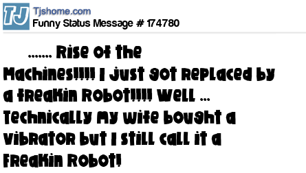 X says ....... Rise of the Machines!!!! I just got replaced by a freakin Robot!!!! Well ... Technically my wife bought a vibrator but I still call it a Freakin Robot!