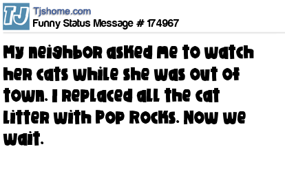 X says My neighbor asked me to watch her cats while she was out of town. I replaced all the cat litter with Pop Rocks. Now we wait.