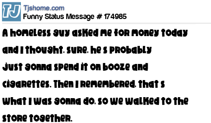 - # 110649 A homeless guy asked me for money today and I thought, sure, he's prolly just gonna spend it on booze and cigarettes. Then I remembered, thats what I was gonna do, so we walked to the store together ツ