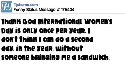 X is Thank God International Women's Day is only once per year. I don't think I can do a second day, in the year, without someone bringing me a sandwich.