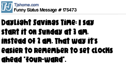 - # 93391 Daylight Savings Time doesn't officially start until 2am... but don't worry about trying to remember to set your clocks... I will be calling everybody then to remind you...