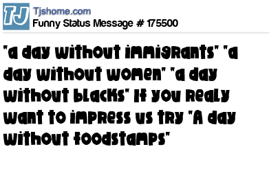 X says "a day without immigrants" "a day without women" "a day without blacks" If you realy want to impress us try "A day without foodstamps"