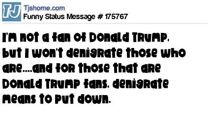 - # 165569 I'm not a fan of Donald Trump, but I won't denigrate those who are....and for those that are Donald Trump fans, denigrate means to "put down."