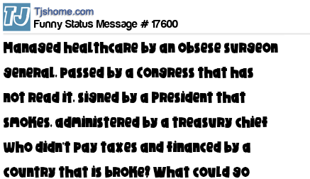 X says managed healthcare by an obsese surgeon general, passed by a Congress that has not read it, signed by a President that smokes, administered by a treasury chief who didn't pay taxes and financed by a country that is broke? What could go wrong?