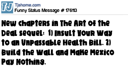 X says New chapters in The Art of the Deal sequel:  1) Insult Your Way to an Unpassable Health Bill. 2) Build the Wall and Make Mexico Pay Nothing.