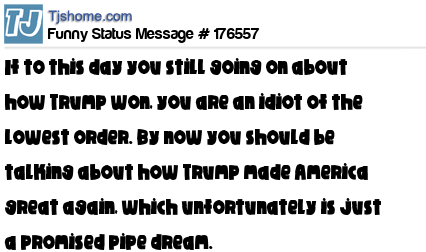 X says If to this day you still going on about how Trump won, you are an idiot of the lowest order. By now you should be talking about how Trump made America great again, which unfortunately is just a promised pipe dream.