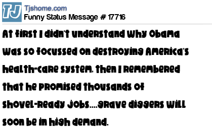X At first I didn't understand why Obama was so focussed on destroying America's health-care system, then I remembered that he promised thousands of shovel-ready jobs....grave diggers will soon be in high demand.