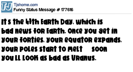 - # 166419 It’s the 40th Earth Day, which is bad news for Earth. Once you get in your forties, your equator expands, your poles start to melt — soon you’ll look as bad as Uranus.