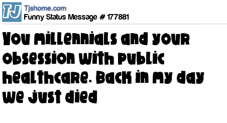 - # 179216 You mellennials and your obsession with public healthcare, back in my day we just died!