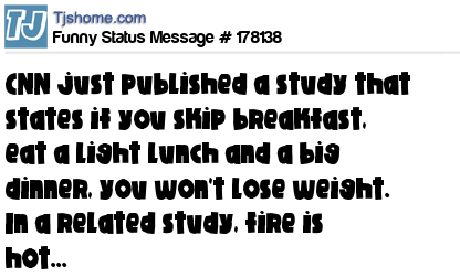 X CNN just published a study that states if you skip breakfast, eat a light lunch and a big dinner, you won't lose weight. In a related study, fire is hot...