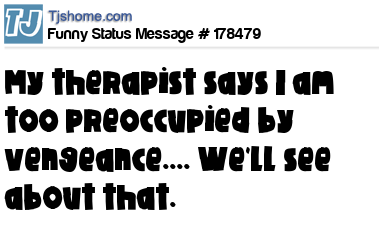 - # 192768 My therapist says I am too preoccupied by vengeance. Yeah, well we'll see about that.