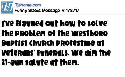 - # 133059 The answer to the Westboro Baptist Church protests of military funerals is to aim the 21 gun salute at them.
