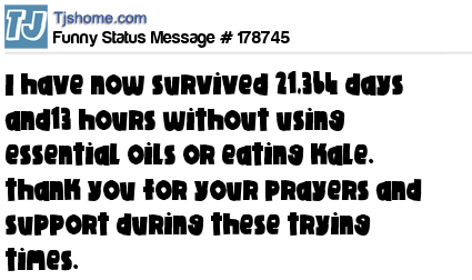 X says I have now survived 21,364 days and13 hours without using essential oils or eating kale. thank you for your prayers and support during these trying times.