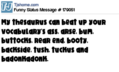 X says My thesaurus can beat up your vocabulary's ass, arse, bum, buttocks, rear end, booty, backside, tush, tuckus and badonkadonk.