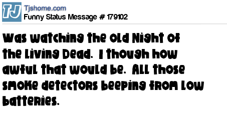 X says Was watching the old Night of the living Dead. I though how awful that would be. All those smoke detectors beeping from low batteries.