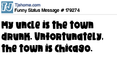 X says My uncle is the town drunk. Unfortunately, the town is Chicago.