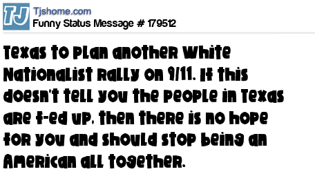 X is Texas to plan another White Nationalist rally on 9/11. If this doesn't tell you the people in Texas are f-ed up, then there is no hope for you and should stop being an American all together.
