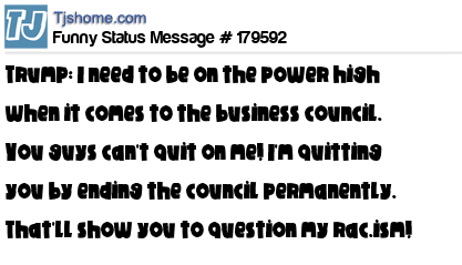 X is Trump: I need to be on the power high when it comes to the business council. You guys can't quit on me! I'm quitting you by ending the council permanently. That'll show you to question my rac.ism!